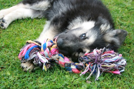 Tout doucement j’apprends aussi « lâche ». Mais je le fais pas à tous les coups. Benh oui, si je lâche ce que j’ai en bouche benh… je l’ai plus ! Mais on me donne un jouet à la place alors ca va. Maintenant j’ai compris. Si je veux mon jouet, il me suffit de prendre un caillou !